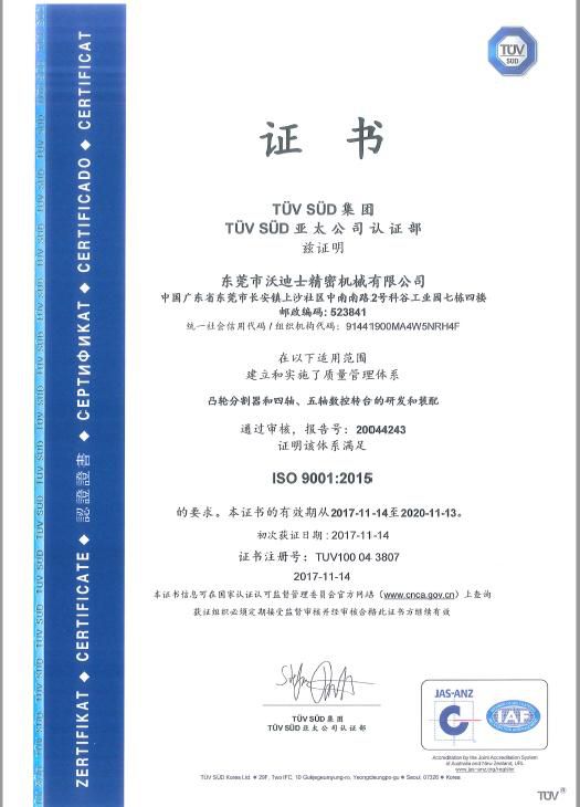 近日沃迪士在"凸輪分割器和四軸、五軸的研發(fā)和裝配”的質(zhì)量管理上的有效性通過了國際權(quán)威認(rèn)證機構(gòu)南德TUV SUD第二階段的嚴(yán)格審廠,獲得了ISO9001:2015 證書。