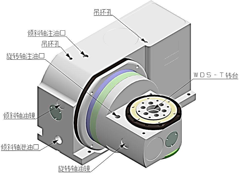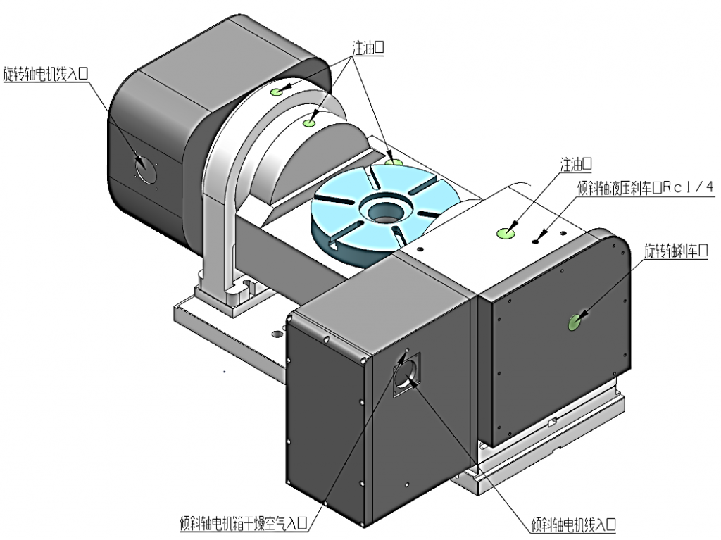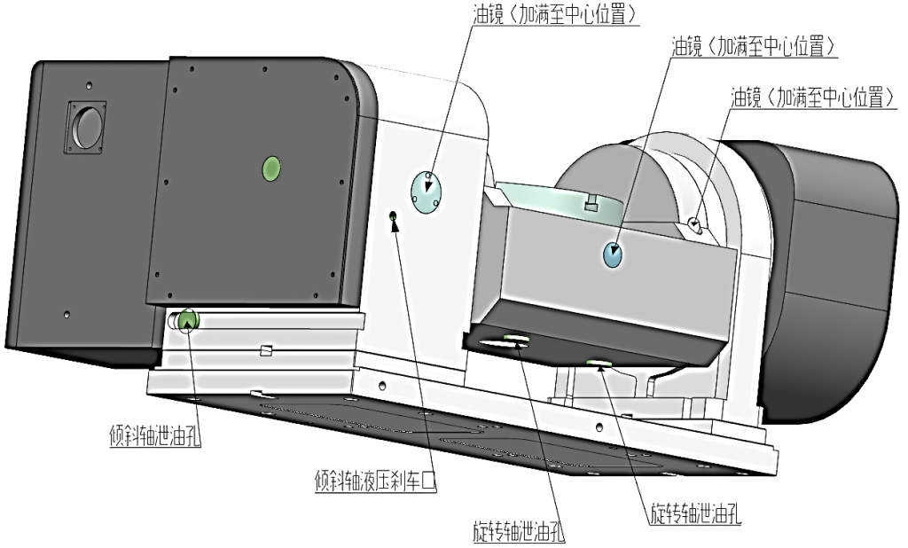 打開轉(zhuǎn)臺(tái)附帶的說明書在目錄中找到【潤(rùn)滑】一項(xiàng),按照其中注明的放油口和進(jìn)油口操作,轉(zhuǎn)臺(tái)上也有相應(yīng)的標(biāo)識(shí),以下是說明書中標(biāo)識(shí)的范例: