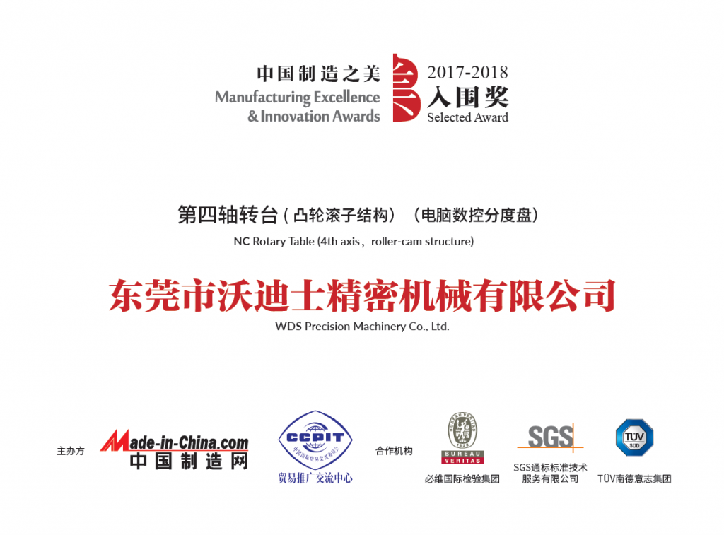 沃迪士參賽產(chǎn)品(第四軸轉(zhuǎn)臺(tái) (凸輪滾子結(jié)構(gòu))(電腦數(shù)控分度盤))經(jīng)過(guò)初評(píng)、終評(píng)兩輪評(píng)選,從中國(guó)制造之美2017屆13個(gè)參賽組別4309件參賽產(chǎn)品中脫穎而出,榮獲2017“中國(guó)制造之美”年度評(píng)選 工業(yè)設(shè)備及組件 類 入圍獎(jiǎng)!并將獲得由活動(dòng)主辦方中國(guó)制造網(wǎng)、貿(mào)促會(huì)貿(mào)推中心,聯(lián)合國(guó)際三大知名認(rèn)證機(jī)構(gòu)SGS、BV、 TüV南德頒發(fā)的榮譽(yù)獎(jiǎng)牌。