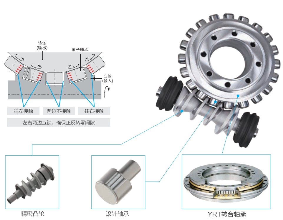- 滾子與凸輪接觸面大 → 剛性比蝸輪蝸桿結(jié)構(gòu)轉(zhuǎn)臺(tái)更高