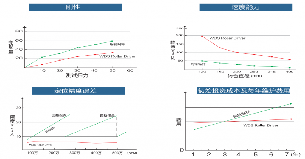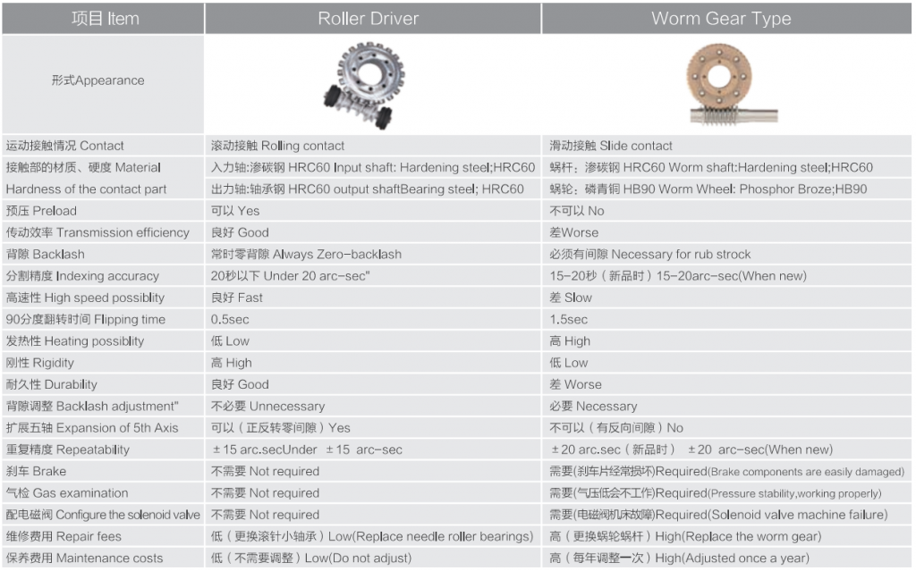 目前市場上的轉(zhuǎn)臺產(chǎn)品以蝸輪蝸桿結(jié)構(gòu)為主。渦輪材料為磷青銅,無法加預(yù)壓,剛性差,隨著使用磨損整個(gè)轉(zhuǎn)臺精度不斷下降,導(dǎo)致極高的后期維修成本,給機(jī)床用戶及代理商都帶來很多困擾和經(jīng)濟(jì)損失。要規(guī)避蝸輪蝸桿結(jié)構(gòu)的缺點(diǎn),蝸輪蝸桿的材料需要特殊處理(如日研、雷曼等高端品牌),但價(jià)格昂貴,一般客戶無力承擔(dān)。